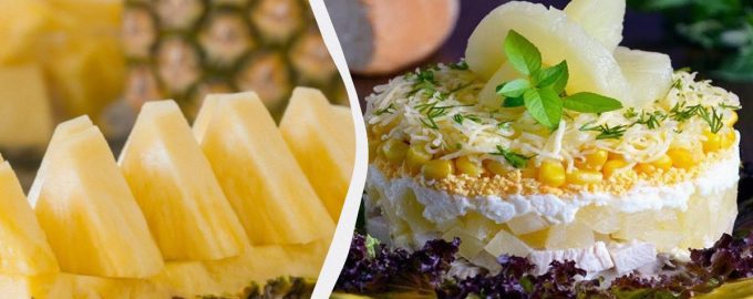 অনেক ছুটির দিনে আনারসের সাথে চিকেন সালাদ রয়েছে – প্রথম নজরে একটি অদ্ভুত যুগল গান যা লক্ষ লক্ষ মানুষকে মুগ্ধ করেছে। মিষ্টি ফল এবং আন্তরিক মাংস একে অপরের পরিপূরক। কাঁকড়া লাঠি সহ বিকল্পটি কম জনপ্রিয় নয় – এটি কোমল এবং বহিরাগত উভয়ই।